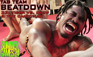 Having acquired Drew as his latest Trophy Boy by beating him into sweaty submission, Candyman sics Drew on Tigerweight Champion Tiger who gets blindsided from the start and then MAULED by both Candyman and Tiger never having a chance to regain his footing and ultimately STRIPPED of his Championship giving Candyman his FIRST-EVER CHAMPIONSHIP! New name: Candyweight Championship!